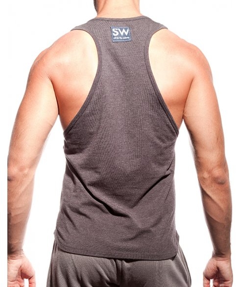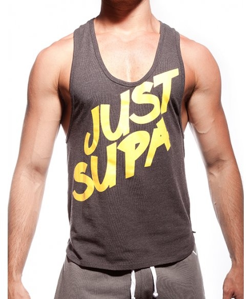 Šedé tílko SUPAWEAR se žlutým potiskem Just Supa. Skvělé jak do fitka, tak na běžné nošení.